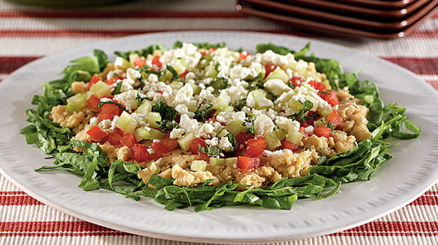 Cooking Tip: The pita wedges and chickpea spread can be made up to one day ahead. Store the pita wedges in an airtight container at room temperature. Cover and refrigerate the chickpea mixture. The remaining ingredients can be chopped and stored in the refrigerator up to 8 hours in advance, but the dip shouldn't be assembled until right before serving.